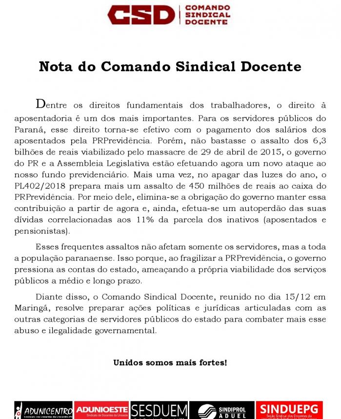 Comando Sindical Docente lança nota sobre a Paranaprevidência