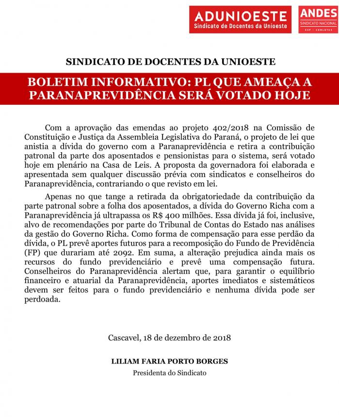 A ADUNIOESTE e o SINTEOESTE, bem como os sindicatos que compõem o FES (Fórum das Entidades Sindicais), convocam todos os servidores a se manifestarem contrários ao PL 402/18 na ALEP