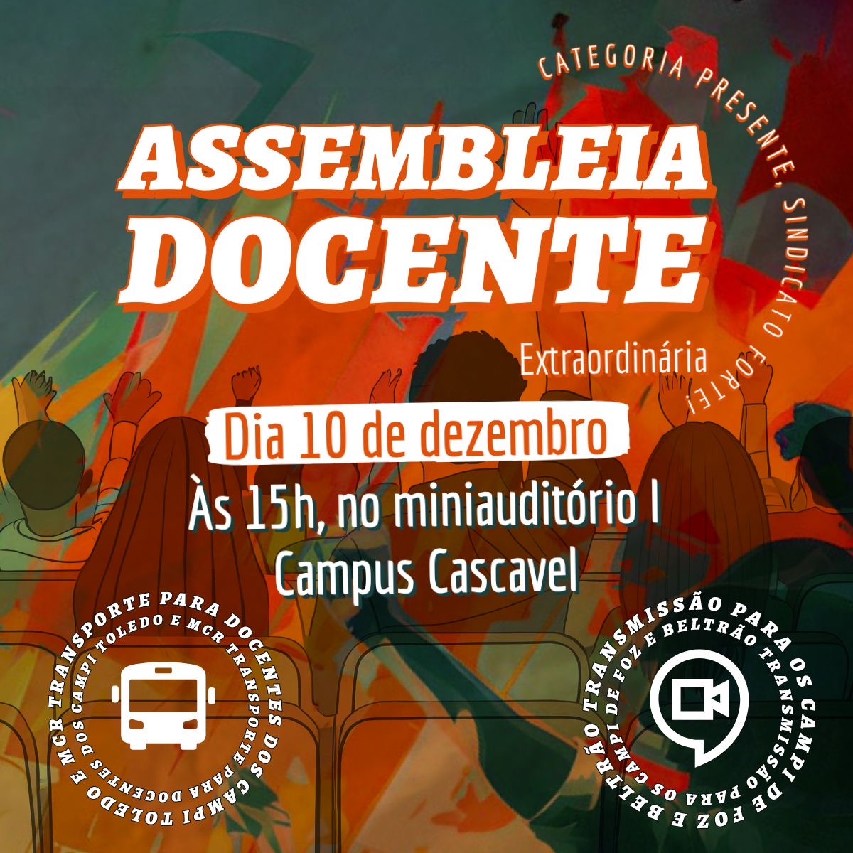 A assembleia também contará com transmissão simultânea para a sala 204, bloco 1, do campus de Francisco Beltrão e no auditório do campus de Foz do Iguaçu. Além disso, haverá transporte disponibilizado para os docentes dos campi de Marechal Cândido Rondon e Toledo
