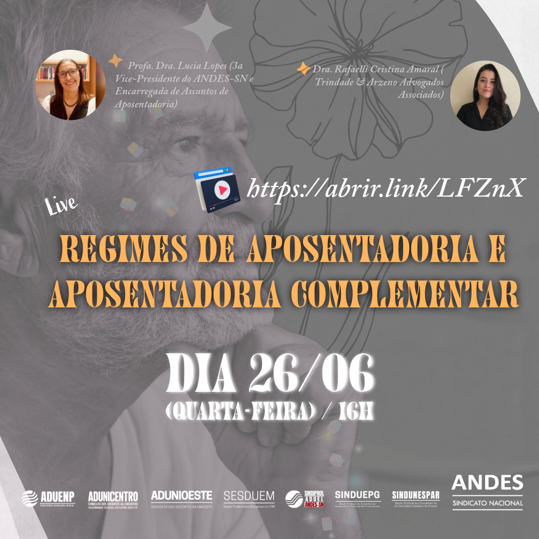 Na próxima quarta-feira, dia 26 de junho, às 16h, ocorrerá uma live sobre regimes de aposentadoria e aposentadoria complementar